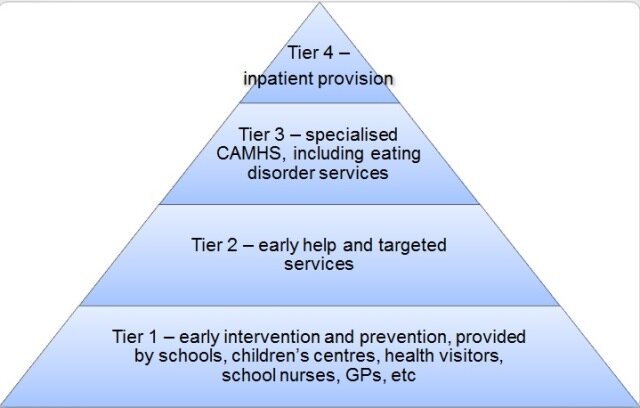 Currently, Hertfordshire’s emotional and wellbeing services for children and young people are commissioned through a tiered system, explained below. We are developing a new approach to emotional wellbeing services for children and young people in Hertfordshire. Called iThrive, it places an emphasis on prevention and early intervention. There’s more information about