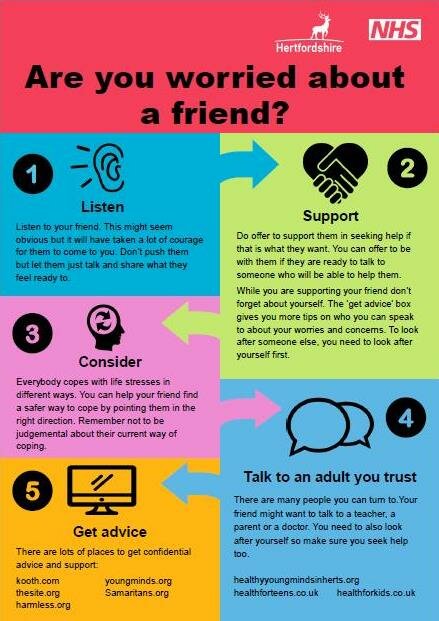 1. Listen – Listen to your friend. This might seem obvious but it will have taken a lot of courage for them to come to you. Don’t push them but let them just talk and share what they feel ready to.